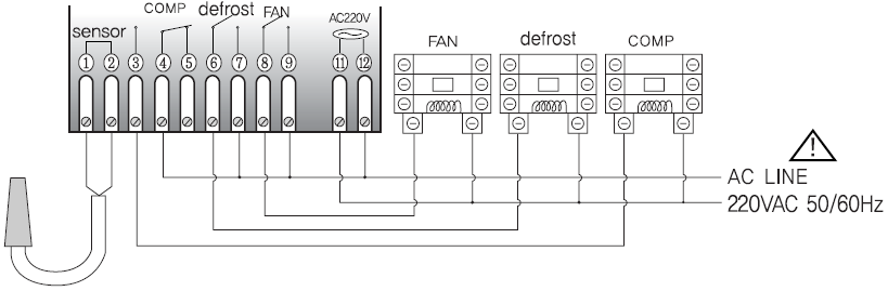 Output | 3 relay (1c 2a 250VAC 2A) 1R (Comp), 2R (Defrost), 3R (FAN) |