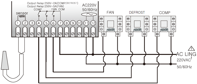 Output | 3 relay (3a 250VAC) 1R (Comp), 2R (Defrost), 3R (FAN) / 1R, 2R(250VAC 2A), 3R (250VAC 5A) |