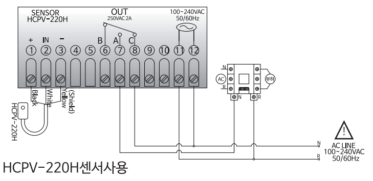 ※ 내부 릴레이의 출력사양이 250VAC 2A 이하이므로 반드시 외부에 파워릴레이나 마그네트를 사용하여