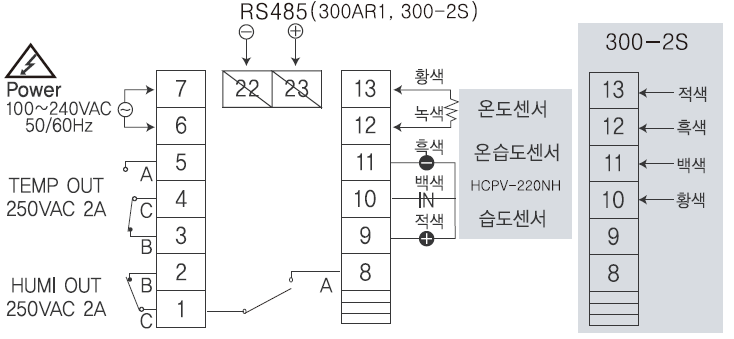 출력 | 2 relay (2c 250VAC 2A) 1R(온도), 1R(습도) |