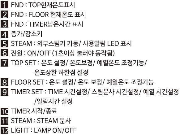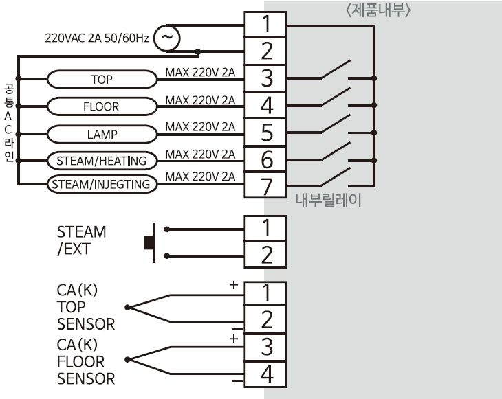 제어 출력 | 5EA : TOP, FLOOR, LAMP, STEAM/HEATING, STEAM INJECTING (220VAC 2A) |