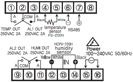 Output | 4 relay (4a 250VAC 2A), 1R(Temp) 2R(Temp), 3R(Humi), 4R(Alarm) |