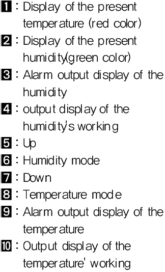 Output | 4 relay (4a 250VAC 2A), 1R(Temp) 2R(Temp), 3R(Humi), 4R(Alarm) |