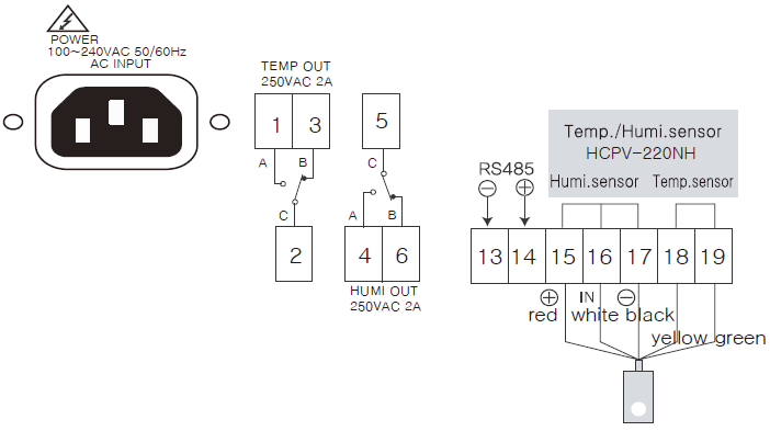 Output | 2 relay (2c 250VAC 2A) 1R(Temp), 2R(Humidity) |