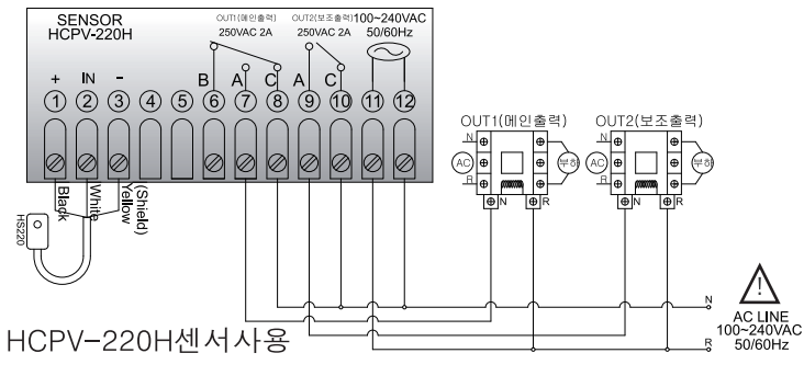 ※ 내부 릴레이의 출력사양이 250VAC 2A 이하이므로 반드시 외부에 파워릴레이나 마그네트를 사용하여