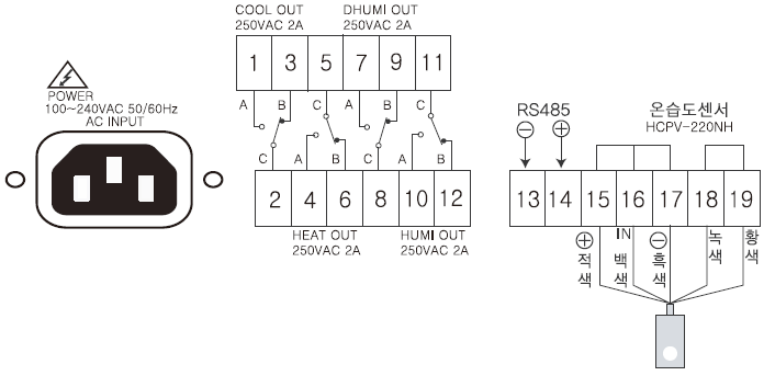 출력 | 4 relay (4a 250VAC 2A), 1R(온도) 2R(온도), 3R(습도), 4R(습도) |