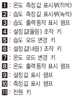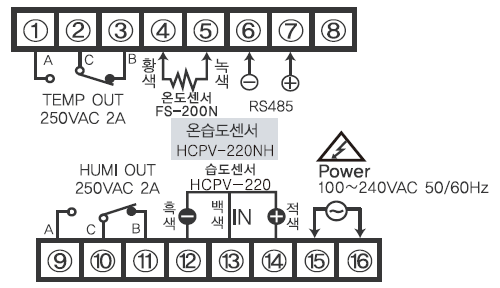 출력 | 2 relay (2c 250VAC 2A) 1R(온도), 2R(습도) |